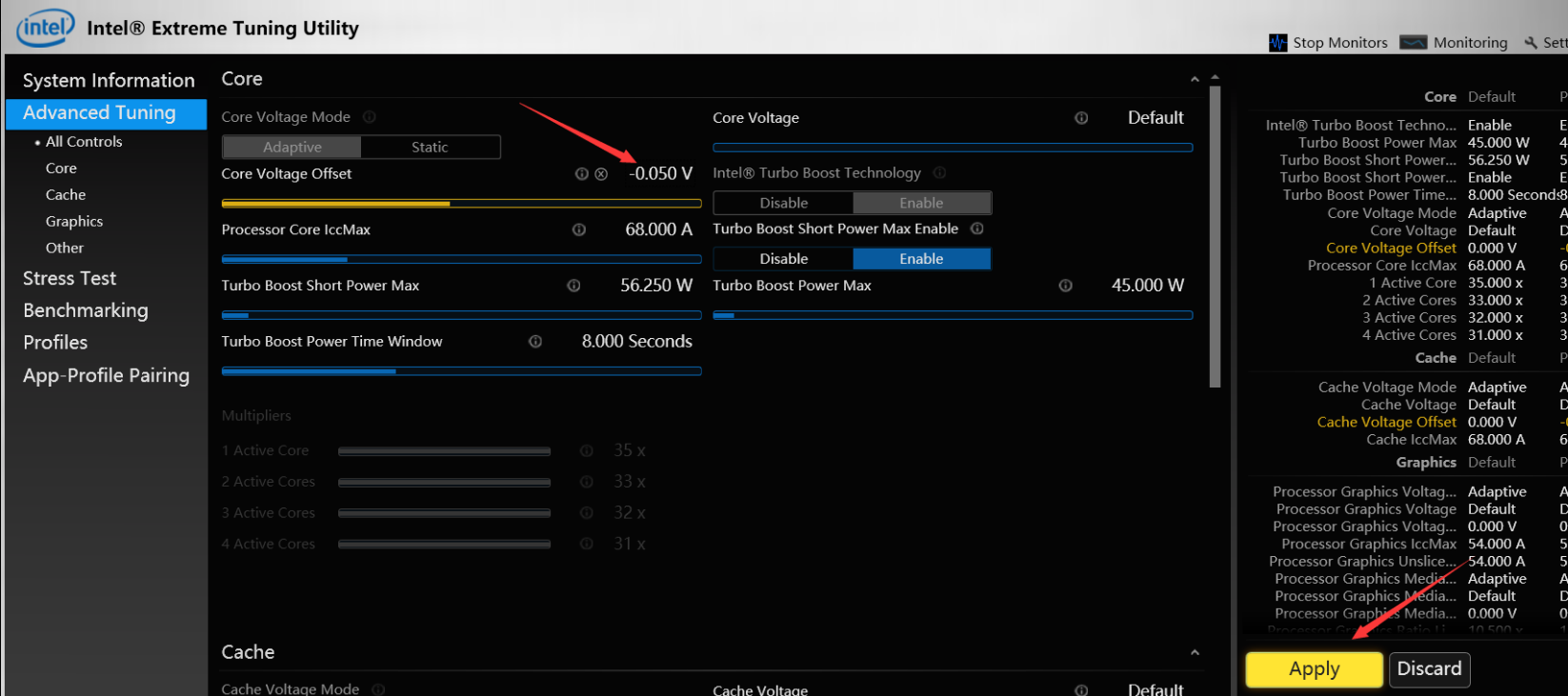 我们就只能一点点的去测试,比如先降低0.05V,然后点击应用(Apply)