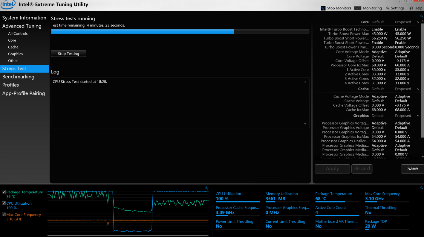 温度68度,全程没有过热降频,频率满频率3.10GHz,功耗29W。