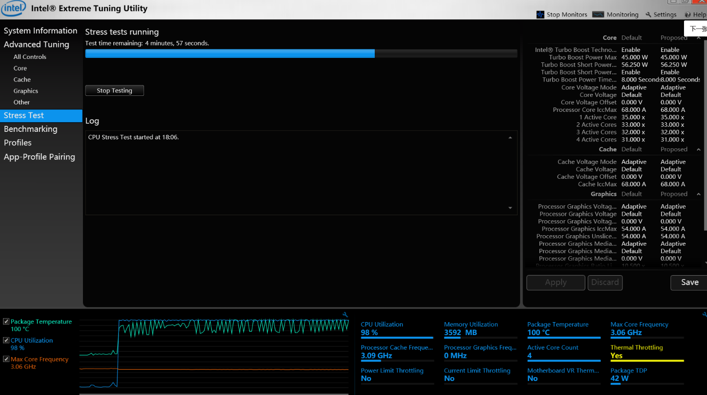 这是机器默认情况下,温度100度,并且触发了过热降频,频率3.06GHz(4核应该保持满载3.10GHz),功耗42W。