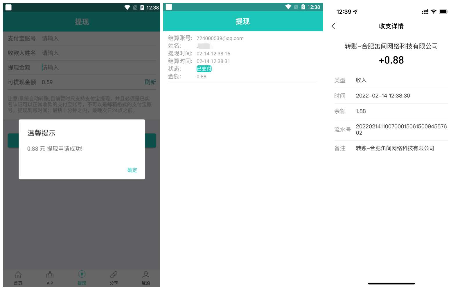 3、提现后基本是秒到账